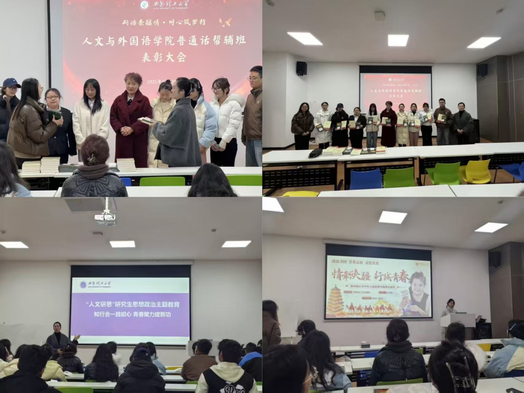 活动伊始,特邀中文系副教授、国家级普通话水平测试专家裴惠云,学生工作办公室主任孟雅莉,预科生辅导员梁雪蓉,对普通话帮辅班研究生志愿者进行了表彰,新疆籍少数民族预科班全体学生共同参与活动。学院普通话帮辅活动作为学风实践重要载体,以语言为纽带,为预科班同学搭建学业提升桥梁,也成为研究生锤炼本领的平台。研究生志愿者借助系统语音指导、考试技巧培训、备课纠音以及课后辅导等方式,与预科班同学相互学习、共同进步。经一个半月帮辅,成效显著:普通话测试一次性通过率达94%,二级甲、乙等占比74%。此次表彰既是对学风实践成果的肯定,更是铸牢中华民族共同体意识的生动实践。秦疆学子互学互助,将民族团结种子扎根心底,推动研究生深化优良学风,彰显担当意识。